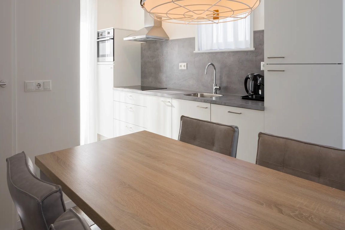 Im Sanitärbereich stehen zwei direkt von den Schlafzimmern zugängliche Badezimmer mit jeweils ebenerdiger Dusche und Waschbecken zur Verfügung. Ergänzt wird die Ausstattung durch ein separates WC sowie eine Waschmaschine und einen Wäschetrockner, die zusätzlichen Komfort bei längeren Aufenthalten bieten. Die offene Küche ist zweckmäßig und modern eingerichtet. Sie verfügt über eine Geschirrspülmaschine, einen Kühlschrank mit Gefrierfach, eine Kombi-Mikrowelle, einen Wasserkocher, eine Kaffeemaschine für Nespresso-Kapseln sowie ein vollständiges Standard-Kücheninventar. Der Außenbereich umfasst eine Terrasse mit Gartenmöbeln, die zum Aufenthalt im Freien einlädt. Eine Terrassenheizung sowie ein umzäunter Garten können optional hinzugebucht werden. Ein Stellplatz für ein Fahrzeug befindet sich direkt an der Unterkunft; zusätzliche Parkmöglichkeiten stehen bei oder in der Nähe der Unterkunft zur Verfügung.