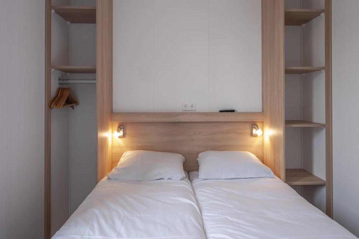 Die 4-Personen-Komfort-Lodge im Beach Resort Nieuwvliet-Bad bietet auf rund 51 m² Wohnfläche eine kompakte und zugleich funktionale Unterkunft für bis zu vier Personen. Die freistehende Bauweise sowie die ebenerdige Raumaufteilung ermöglichen eine komfortable Nutzung aller Bereiche. Die Lodge verfügt über zwei Schlafzimmer mit jeweils zwei Boxspring-Einzelbetten. Ein Schlafzimmer ist zusätzlich mit einem TV ausgestattet. Bettdecken und Kopfkissen sind vorhanden.