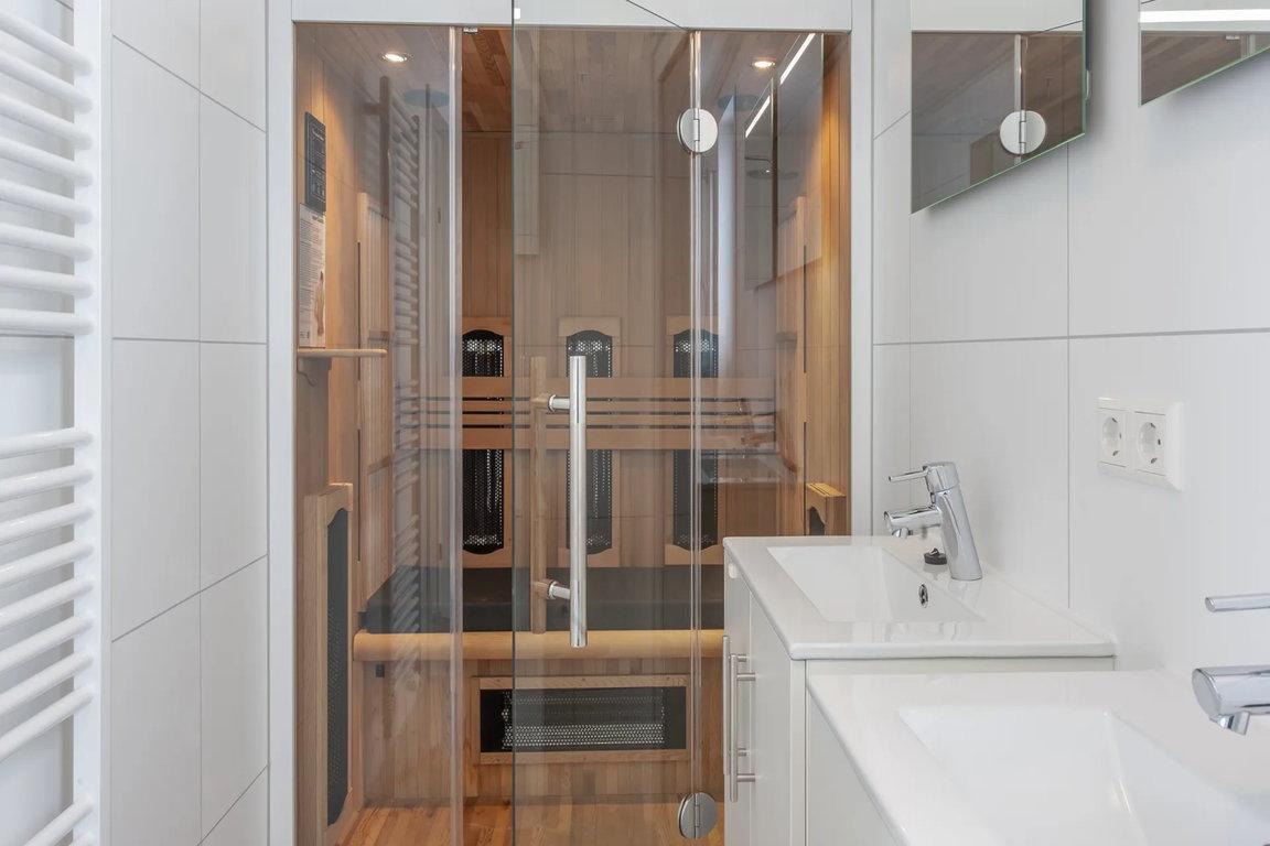 Der Wohn- und Essbereich bildet den zentralen Aufenthaltsraum und umfasst eine Sitzecke, eine Essecke sowie einen Smart-TV. Das Badezimmer ist mit einer ebenerdigen Dusche und einem Waschbecken ausgestattet. Ergänzt wird der Sanitärbereich durch ein separates WC sowie eine komfortable Infrarotsauna, die zusätzlichen Komfort und Entspannung bietet. Die offene Küche ist modern und zweckmäßig eingerichtet. Sie verfügt über eine Kombi-Mikrowelle, einen Kühlschrank mit Gefrierfach, eine Geschirrspülmaschine, einen Wasserkocher, eine Kaffeemaschine für Nespresso-Kapseln sowie ein vollständiges Standard-Kücheninventar.