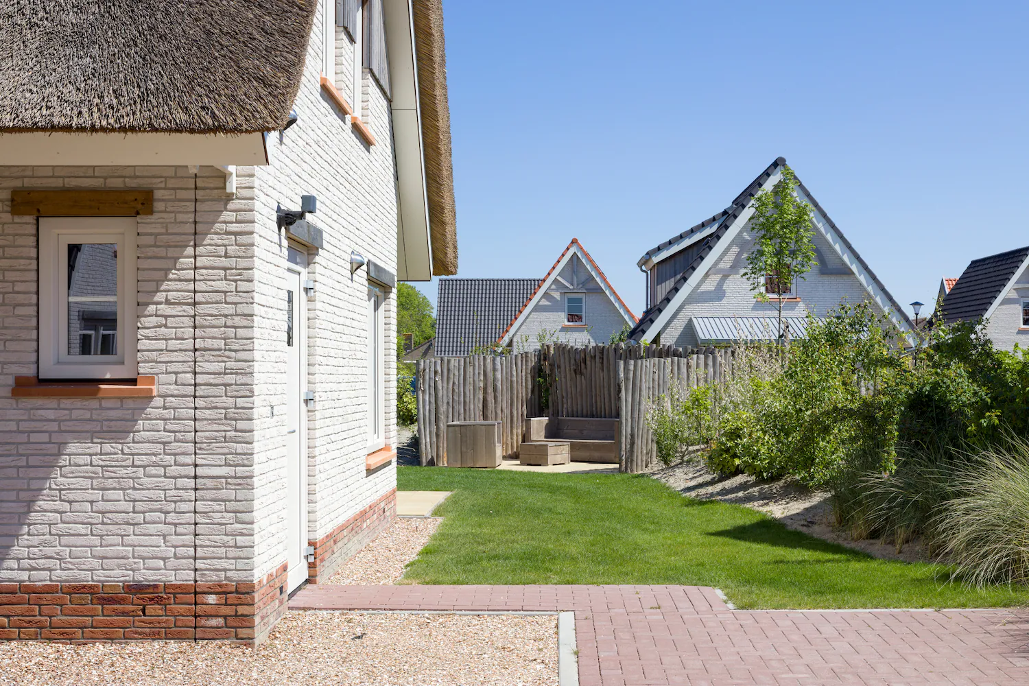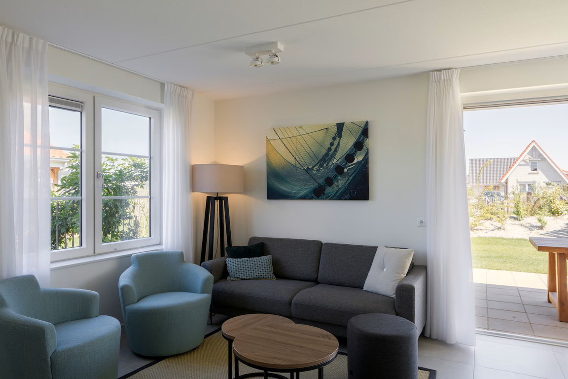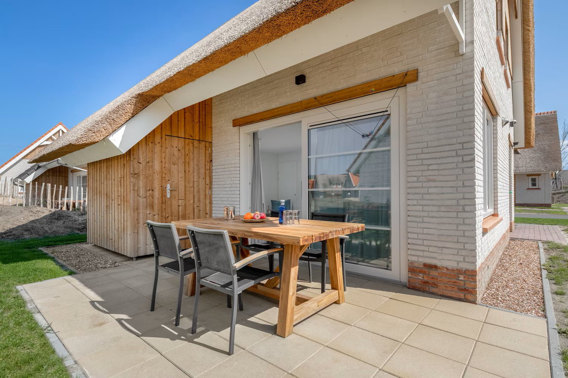 Das Wohnzimmer bietet mit Schiebetüren bequemen Zugang zur Terrasse und zum Garten, die Teilüberdachung, die Gartenmöbel und der Sonnenschirm sorgen für komfortable und entspannte Nutzung des Aussenbereiches. Einige der insgesamt 13 V4A Luxe-Ferienhäuser, die vorrangig im nordöstlichen Teil des „Beach Resort Nieuwvliet-Bad“ liegen, haben zusätzlich Fußbodenheizung im Wohnzimmer, eine „Rain Shower“-Dusche, Terrassenheizer und Lounge-Möbel. Je nach Villen-Typ sind Haustiere wie Hunde oder Katzen willkommen, sind die Gärten eingezäunt und liegen die Ferienhäuser in Spielplatznähe. Zu den Villen des Typs V4 gehört ein Stellplatz für einen PKW; WiFi/WLAN ist gratis.