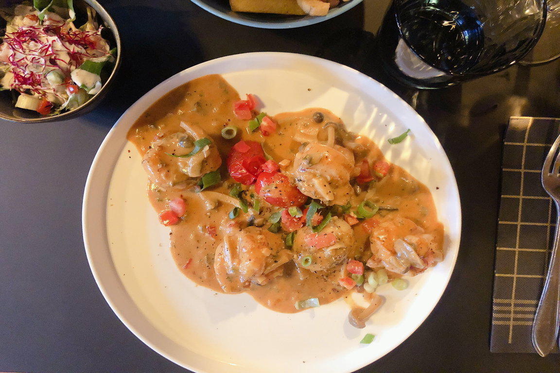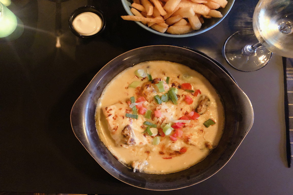Nach einem Aperitif in der Sitzecke mit der Atmosphäre einer Kajüte eines seeländischen Kapitäns und Blick auf die Häuser in der Nieuwvlieter Dorfstraße erfreuten wir uns an einem „Gratinierten Vissersbord“ und „Scampis nach Andys Art“: Die mit einer delikaten Käsekruste überbackenen Fische und Meeresfrüchte bestanden aus Lachs und Rotbarbenfilet sowie Coquille St. Jacques, Flusskrebsen und Miesmuscheln. Das Ensemble tummelte sich in einer rahmigen Sauce, die nach dem Verzehr der Meerestiere sich lohnte als Köstlichkeit zu löffeln. Die ordentliche Scampiportion war an einer tomatigen, frisch zubereiteten Sauce angerichtet. Beide Gerichte wurden mit perfekt-frischen und knusprigen Pommes-Frites und einer kleinen Salatbowl serviert. Die dazu gewählten Weine, Rosé und Cabernet Sauvignon, sorgten in Begleitung mit dem freundlichen, individuellen und aufmerksamen Service und dem Dessert-Finale, einer hausgemachten Mousse aus dunkler Callebaut-Schokolade, für ein gelungenes Gourmeterlebnis im „Chez Pierre“. Nicht nur Erwachsene dürfen sich an der Vielfalt der Speise- und Getränkekarte und der Qualität der Gerichte erfreuen: Kleine Gäste genießen aus dem Angebot an Kids-Food beim „Chez Pierre“ zum Beispiel Fischkroketten und Pommes oder den niederländischen Klassiker Hühnchenfilet mit Apfelmus.