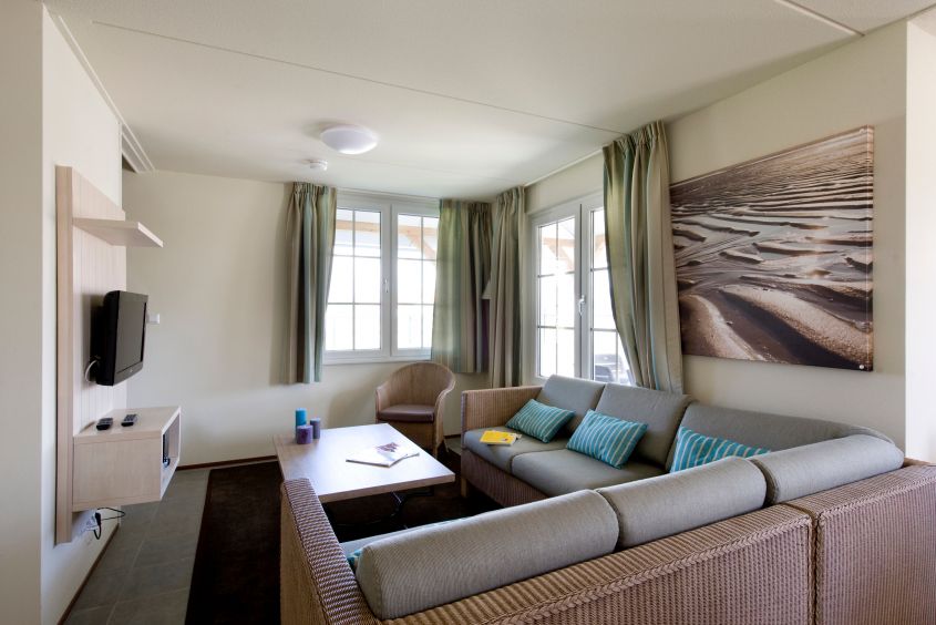 Der versetzt gebaute Bungalow in der „Noordzee Residence Cadzand-Bad“ ist Teil von 3 Wohnungen unter einem Dach, die über einen gemeinschaftlichen Eingangbereich erreicht werde. Das Ferienhaus mit einer Wohnfläche von 86 m2 eignet sich für bis zu 6 Personen, aber besonders für Familien mit kleinen Kindern, da es mit einem „Kinder-Plus-Paket“ ausgestattet ist; es besteht aus Campingbettchen (ohne Matratze), Kinderstuhl, Laufstall, Babybett, Treppengitter, kindersicheren Steckdosen und Gartenteil mit Umzäunung.