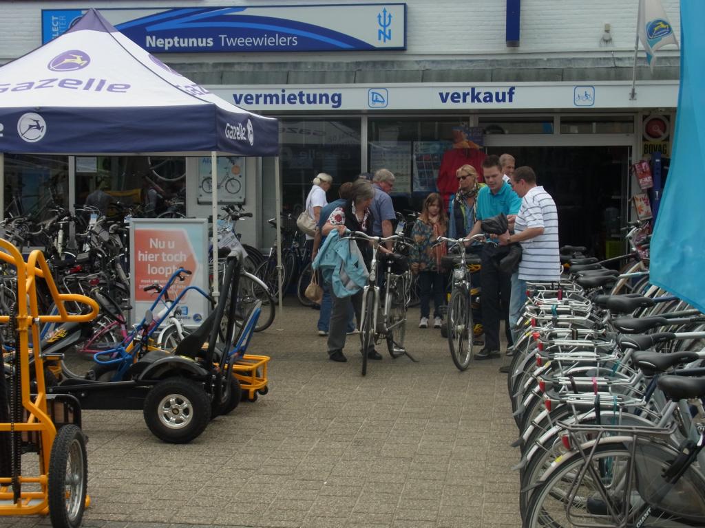Im Ortszentrum in zentraler Lage in der Ladenzeile am Duinplein in Cadzand-Bad bietet „Neptunus Tweewielers“ seit 25 Jahren fachkundige Beratung, einen Fahrrad-Shop mit Reparatur-Werkstatt sowie solide Fahrräder mit mindestens drei Gängen und der Wahl zwischen Hand- und Rücktrittbremse als Standardausstattung. Im großen Vermiet-Angebot sind auch „Mamafiets“ mit zwei Sitzen vorne und hinten sowie Tasche, „Bakfiets“ mit einem Kasten zum Kindertransport und natürlich Kinderräder in unterschiedlichen Größen. Zudem vermietet „Neptunus Tweewielers“ Hundekörbe fürs Rad, Bollerwagen, Tretautos für 2 oder 4 Personen und auch Elektro-Bikes.