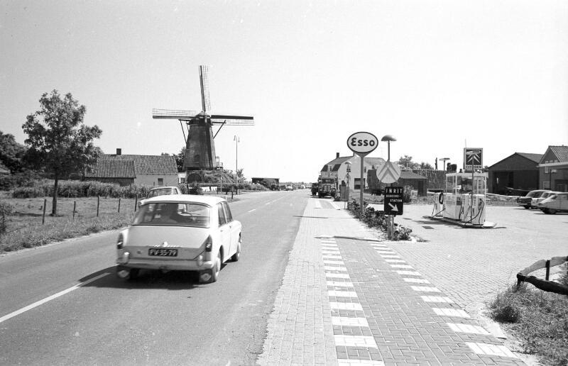 Ortseingang von Cadzand-Dorf mit Windmühle "Het Nooitgedacht" und ESSO-Tankstelle Richtung Zuidzande um 1966