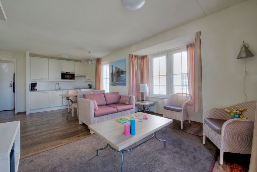 Richtig viel Platz bietet dieser Gruppenbungalow im Ferienhauspark „Noordzee Residence Cadzand-Bad“: Bis zu 15 Personen können auf 218 m² Wohnfläche mit insgesamt 7 Schlafzimmern einen gemeinschaftlichen Urlaub in angenehmer und ausreichender Privatsphäre verbringen. Ein gemeinsamer Eingangsbereich führt zu drei großen Wohnungen über zwei Geschosse; im gemeinschaftlich genutzten Erdgeschoss befinden sich drei Wohnzimmer, die miteinander verbunden sind. Jedes Wohnzimmer hat Fußbodenheizung und Flügeltüren zur großen Terrasse. Ebenfalls ebenerdig liegen drei komplett eingerichtete Küchen mit jeweils Geschirrspüler, Kühl-/ Gefrierkombination und Mikrowelle sowie drei Einzel-Toiletten.