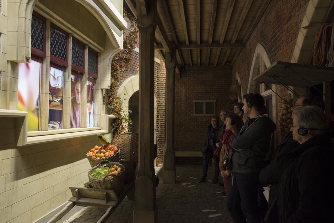 Der rote Faden ist die ergreifende Liebesgeschichte des Lehrlings Jacob und Anna, die den Besucher multimedial mit Filmen, Musik und Düften die Historie im wahrsten Sinn des Wortes sinnlich nacherleben läßt – die Düfte des Badehauses, der herabrieselnder Schnee in den Straßen des alten Brügges oder das schwappende Wasser des belebten Hafens sorgen für eine informative und unterhaltsame Geschichts-Stunde in Brügge. Abschließen kann man den Besuch mit einer Erkundungstour durch die mittelalterliche Architektur mit dem VirtualReality-Erlebnis und einer Bierverkostung im Duvelorium Grand Beer Café.