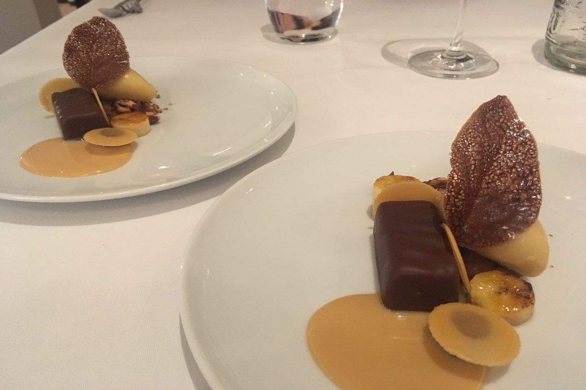 Unsere Reise in Sachen Geschmackskunst a la „Dell`Arte“ startete mit knusprigem selbstgebackenen Brot, Olivenöl, Meersalz und dem Gruß aus der Küche: Ein Trio aus einer Ziegenkäse-Lollipop Kugel mit zarter Mango umhüllt, einem zarten Forellenmousse auf pikantem Pumpernickel und einem Humus-Duo mit knackigen Pitabrot-Chips. Mit einem offenen, trockenem Glas Weißwein setzten wir die von Sous-Chefin Manouk Wols, Gewinnerin Young Chef Awards 2018, komponierte Gourmet-Kunstreise der Vorspeise genussvoll fort: Nordseegarnelen in Rettich-Cannelloni mit einem Rote Beete-Dreierlei als zarte Scheiben, Eis und Mousse. Das Hauptgericht – ein zartes Glattbuttfilet an gedünstetem Porree mit knackigen Knopfchampignons und zarter Kartoffelmousseline an weißem Butterschaum – überzeugte geschmacklich als kunstvoller Höhepunkt, erhielt aber leider einen kleinen Maluspunkt aufgrund leicht mangelnder Wärme. Das süße Ende, das sogar den Dessert-Abstinenzler zugreifen ließ und zu Begeisterungsbekundungen motivierte, bestand aus einer zarten Dreifach-Liaison aus Banane und Schoko: Mini-Banane, Bananensorbet, Bananenmousse umhüllt von zarter Schokoblatthaut an schokolierten, gerösteten Pekannüssen. Nicht zu vergessen, dass auch die zum frisch aufgebrüht Tee gereichten Petit Fours aufgrund der winterlichen Saison ein delikates Geschmacks-Finale waren: Spekulationsküchlein, Limonenmoussecreme und Granatapfel-Dominostein.