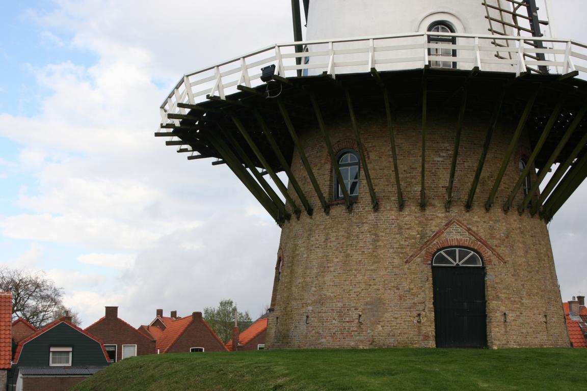 Imposant und weithin sichtbar: Mitten im pittoresken Polderdorf IJzendijke erhebt sich die Windmühle „De Witte Juffer“ auf einem fünf Meter hohen Hügel mit langen Zufahrtsrampe – umringt von den Wohnhäusern von IJzendijke. Die runde Mühle wurde 1841 erbaut und ist aus Steinen gebaut, verputzt und getüncht; sie wurde zum Getreidemahlen eingesetzt und hat eine Spannweite von 23,90 Metern.